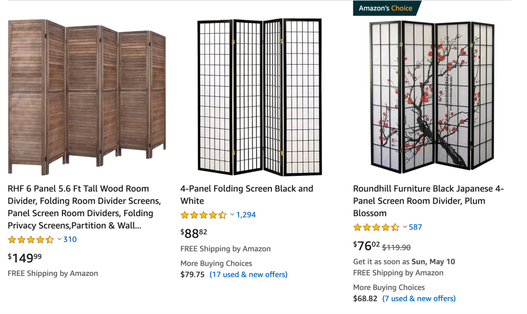 在Amazon或者二手家具交易里就可以购买到屏风,价格在70-200刀左右。但是,屏风的大小和高度都不够,只能略微遮挡室内活动,并不能达到隔音和遮光,所以无法构建完美的私人空间。